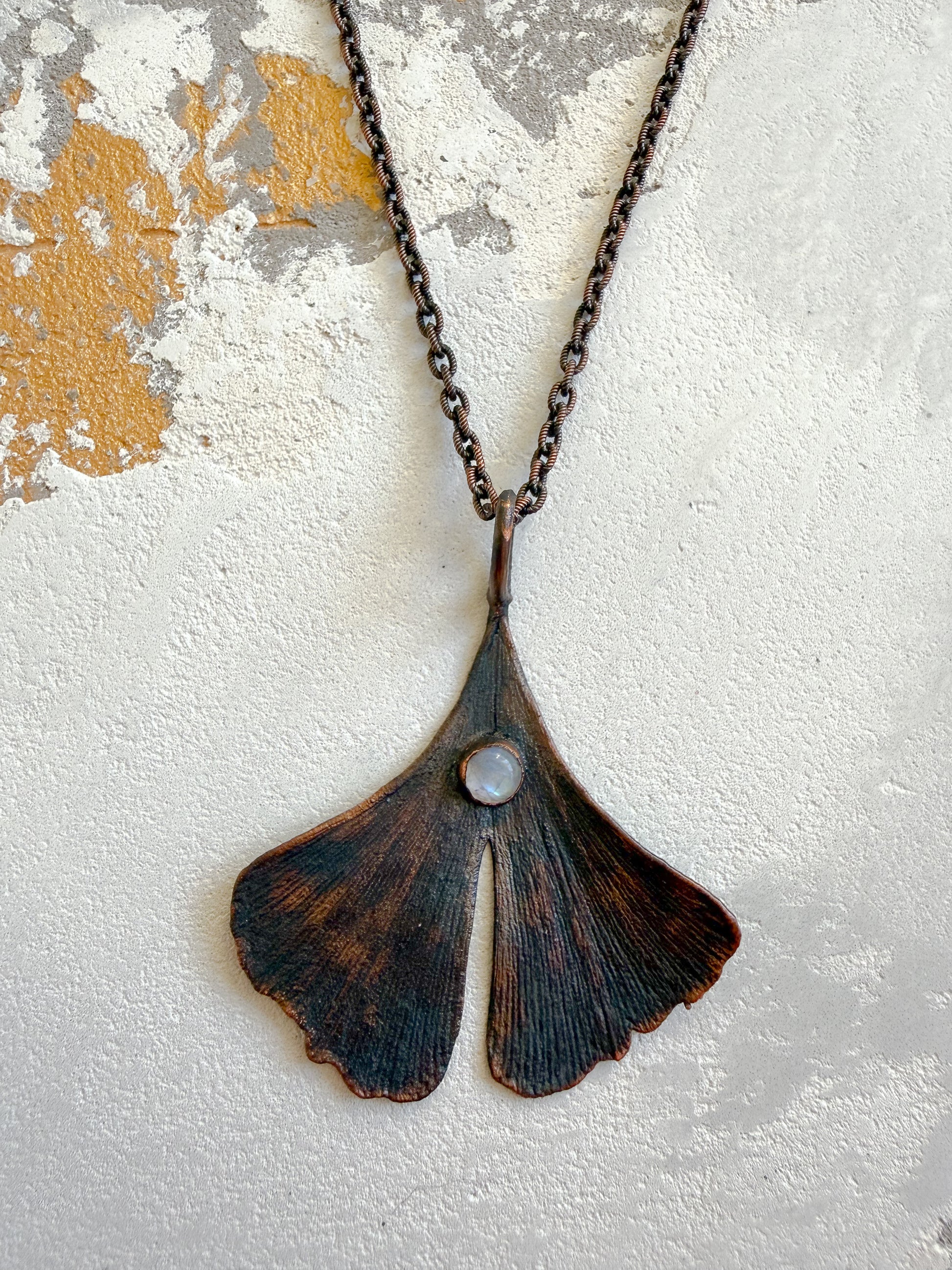 A real ginkgo leaf transformed through copper electroforming, capturing every delicate vein and curve in a lasting, organic form. Its warm, earthy copper glow beautifully frames a natural moonstone that brings a soft, luminous shimmer and a sense of calm, intuitive energy.