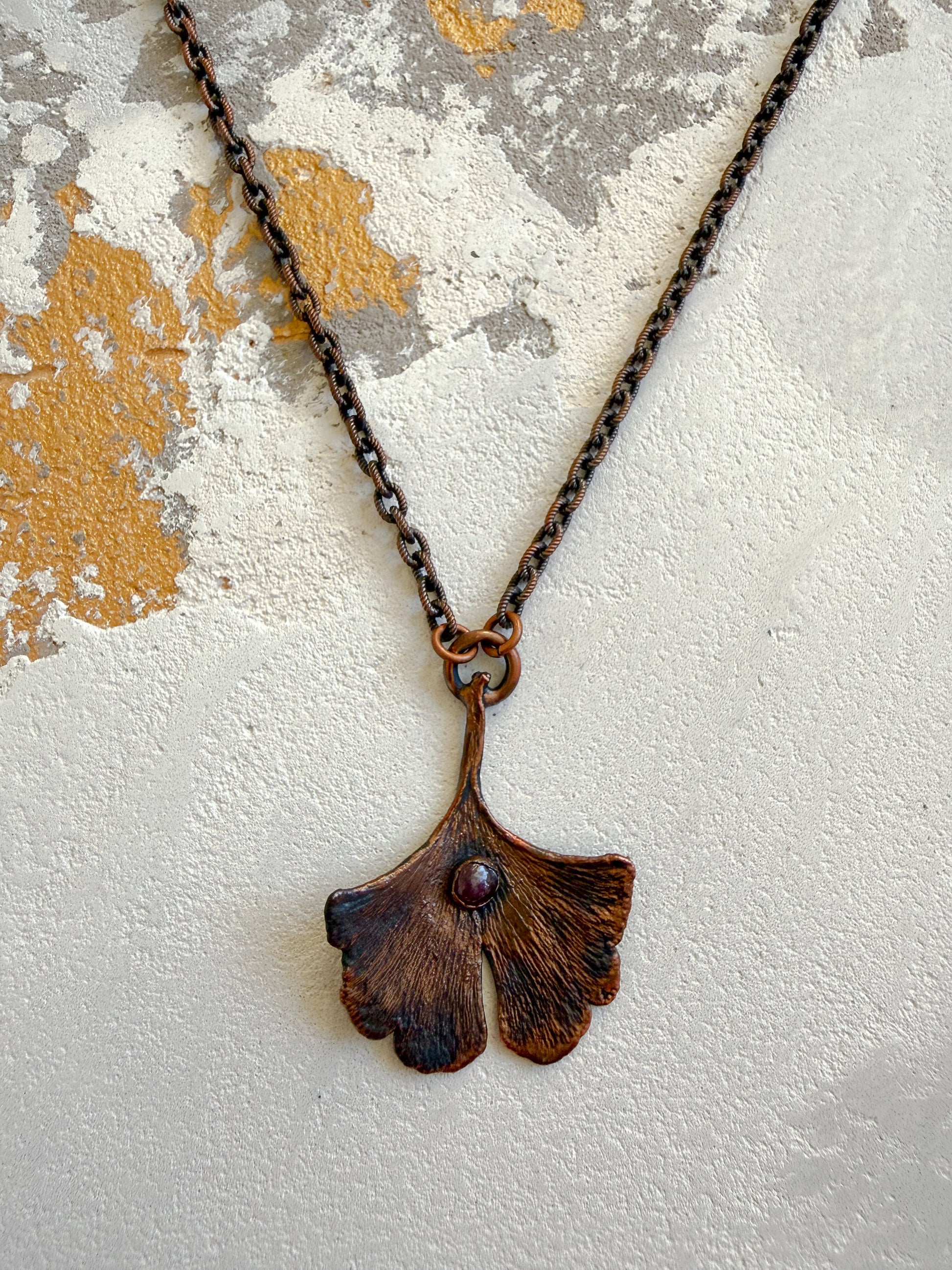 A real ginkgo leaf transformed through copper electroforming, capturing every delicate vein and curve in a lasting, organic form. Its warm, earthy copper glow beautifully frames a natural ruby, adding a vibrant touch of red and a sense of vitality and passion.